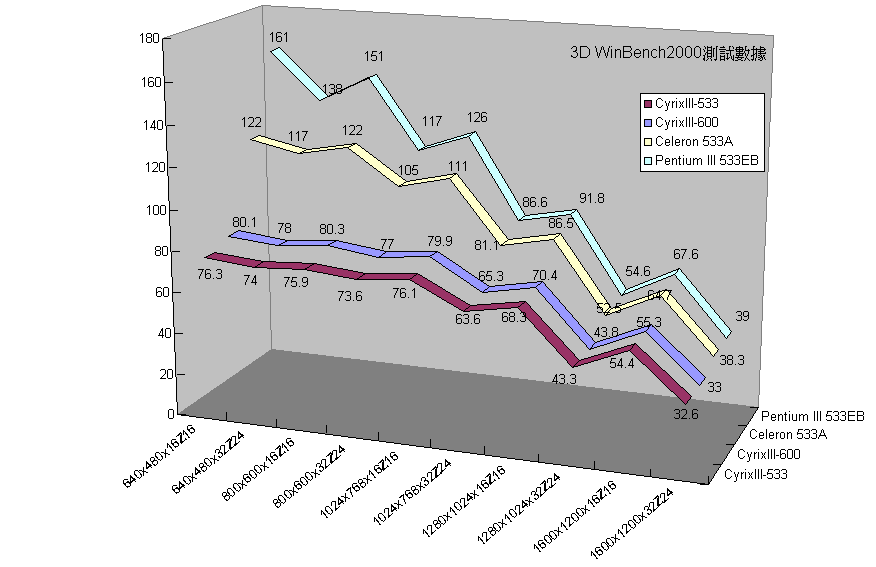 ■测试配备 在台湾威盛的协助下,他们提供了一颗CyrixⅢ-533MHz,以及支持Samuel 倍频率调整的新主机板(伟格SL-65KV With VIA BIOS) ,是一块Socket370 加 威盛694x(ApolloPro133a) 的主机板,它支持Samuel的倍频率调整,笔者也 藉此「小超」了一下CyrixⅢ-533 ,把倍频率调到4.5x,以普通的散热风扇 ,在未加压的情形下,直上133x4.5=600MHz,而且也有部份实测数据。 在国外的测试中,还有人以超级散热风扇直接超到667MHz、甚至733MHz ,看样子这一批CyrixⅢ的超频潜质还不错。可惜笔者手边没有水冷或其 它高性能的散热风扇,主机板也没有提供电压调整的功能,所以无法成 功的超频到667MHz(133x5) ,来进行数据的测试。 另外,由于笔者初测结果数值有些偏低,另外找了一块微星(MSI)MS-6309 主机板,同样也是威盛694x芯片组,实测性能也还不赖,因此也拿来作 测试。这两块694x主机板,都用一样的显示卡、硬盘与VCMSDRAM来测试 结果,以微星的性能较佳;我们的533MHzcyrixⅢ实测数值,是在微星主 机板下的测试结果。 可惜在截稿之前,微星仅有能侦测Samuel的BIOS韧体码,并没有能开启 Samuel倍频率的选项,因此只能就该处理器的预设频率(133 x 4),以标准 的533MHz来测试,所以600MHz(133x4.5)这个属于超频的时钟部份,是改 以伟格SL-65KV来进行测试了,而且只有一部份的数据(Windows 98)。 我们分别将CyrixⅢ-533MHz,测533MHz(133x4)以及600MHz(133x4.5、超 频)两组数据,另外为了对照,我们也找来了0.18μ制程的 Celeron-533MHz(66MHz x 8) ,以及PentiumⅢ-533EB(133MHz x 4)来测试。 |