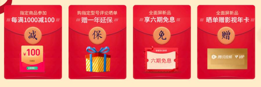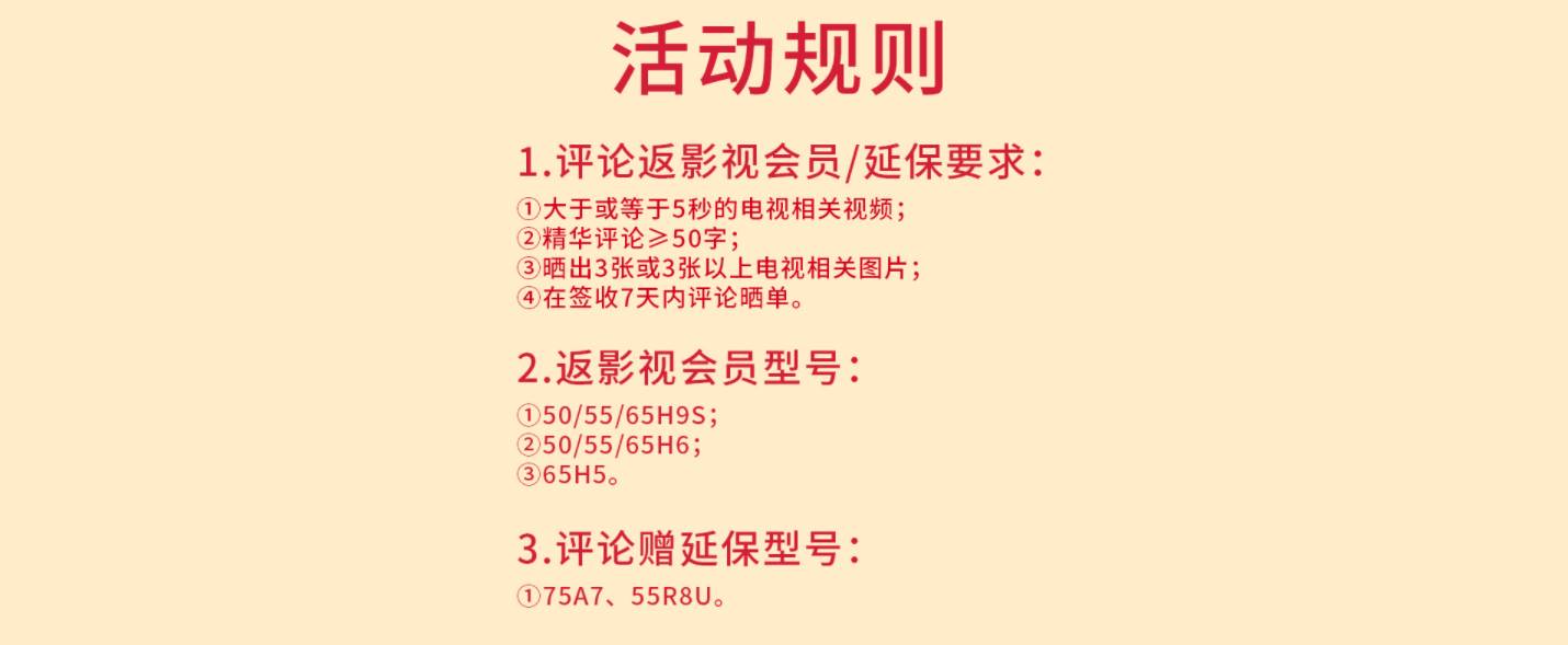 活动期间,购买创维全面屏电视新品可享六期免息,指定商品参加每满1000减100活动,购买指定产品或按规则评论即可得到影视会员和延保服务,值得注意的是,晒单时,请消费者仔细阅读活动规则,并在规定日期内晒出真实使用感受,外观等体验。