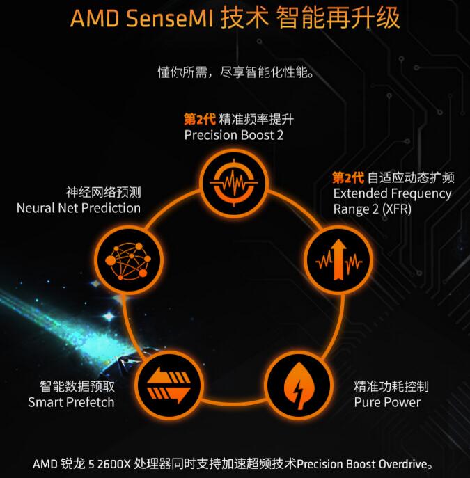 锐龙5 2600与锐龙5 2600X处理器号称双雄绝不为过,两款产品像两兄弟一样一高一低相辅相成,在实力上两款产品更是非常给力,不管是用户使用其中哪款处理器都能带来绝佳的体验以及舒适的操作手感,同时让办公更加富有灵感,轻松解决任何问题。两款处理器还搭载了AMD SenseMI技术,这让用户不仅能感受性能实力的强大还可以在办公中更加智能化,是不可多得的一项AMD黑科技。