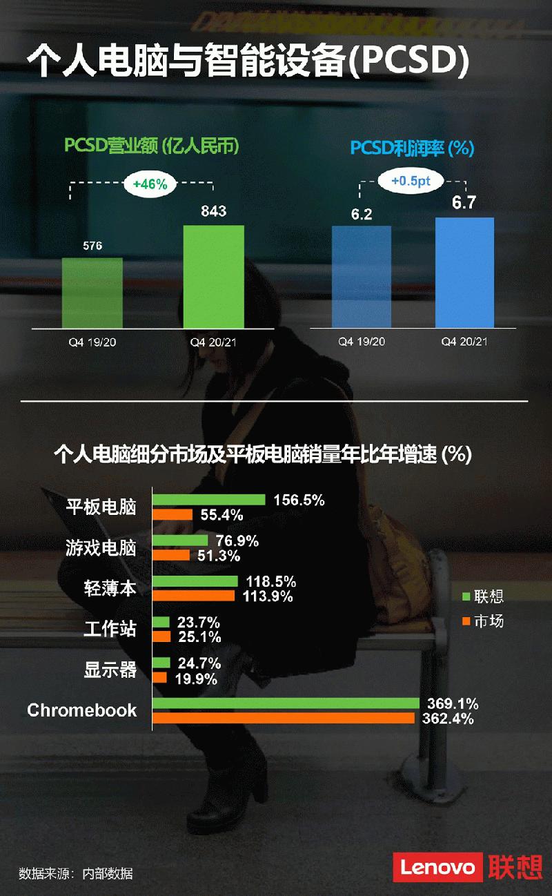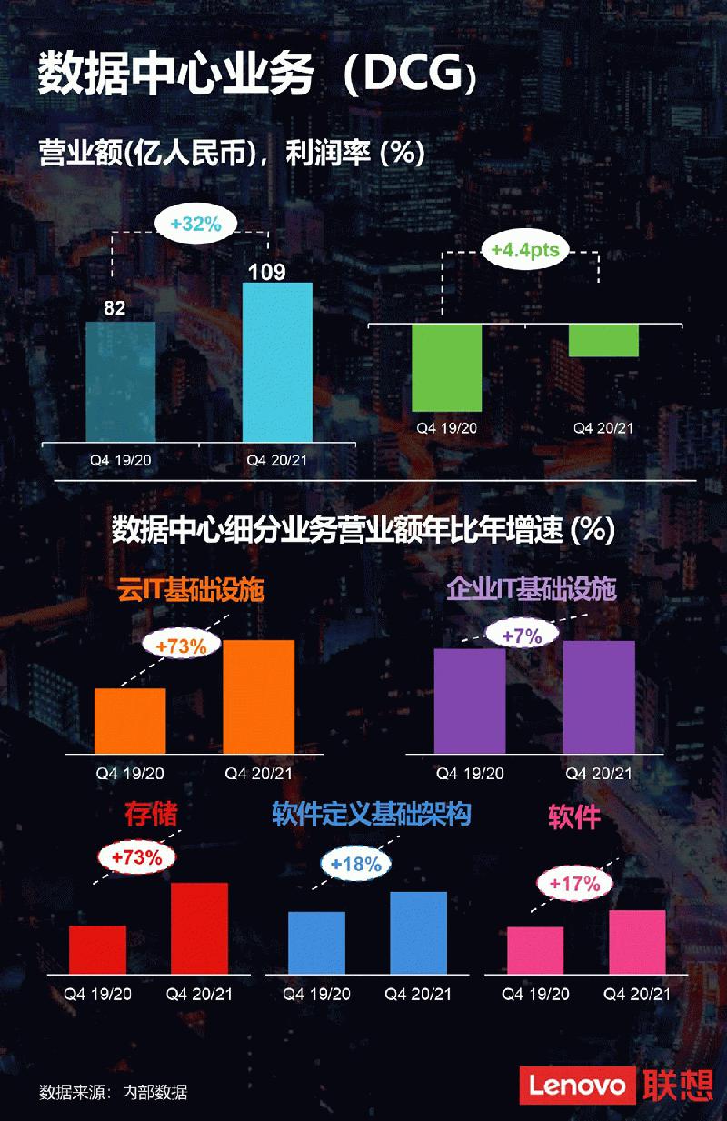2020/21财年第四季度,智能设备业务集团中的个人电脑和智能设备业务营业额超过840亿人民币,同比增长超过46%。同时税前利润率达到了6.7%的历史新高;移动业务迅速从疫情影响下恢复,营业额同比猛增86%,税前利润达到1.4亿人民币,达并购摩托罗拉移动以来的新高;数据中心业务营业额年同比猛增32%,利润率年同比改善了4.4个百分点;服务和软件业务营业额年同比增速达到创纪录的44%。