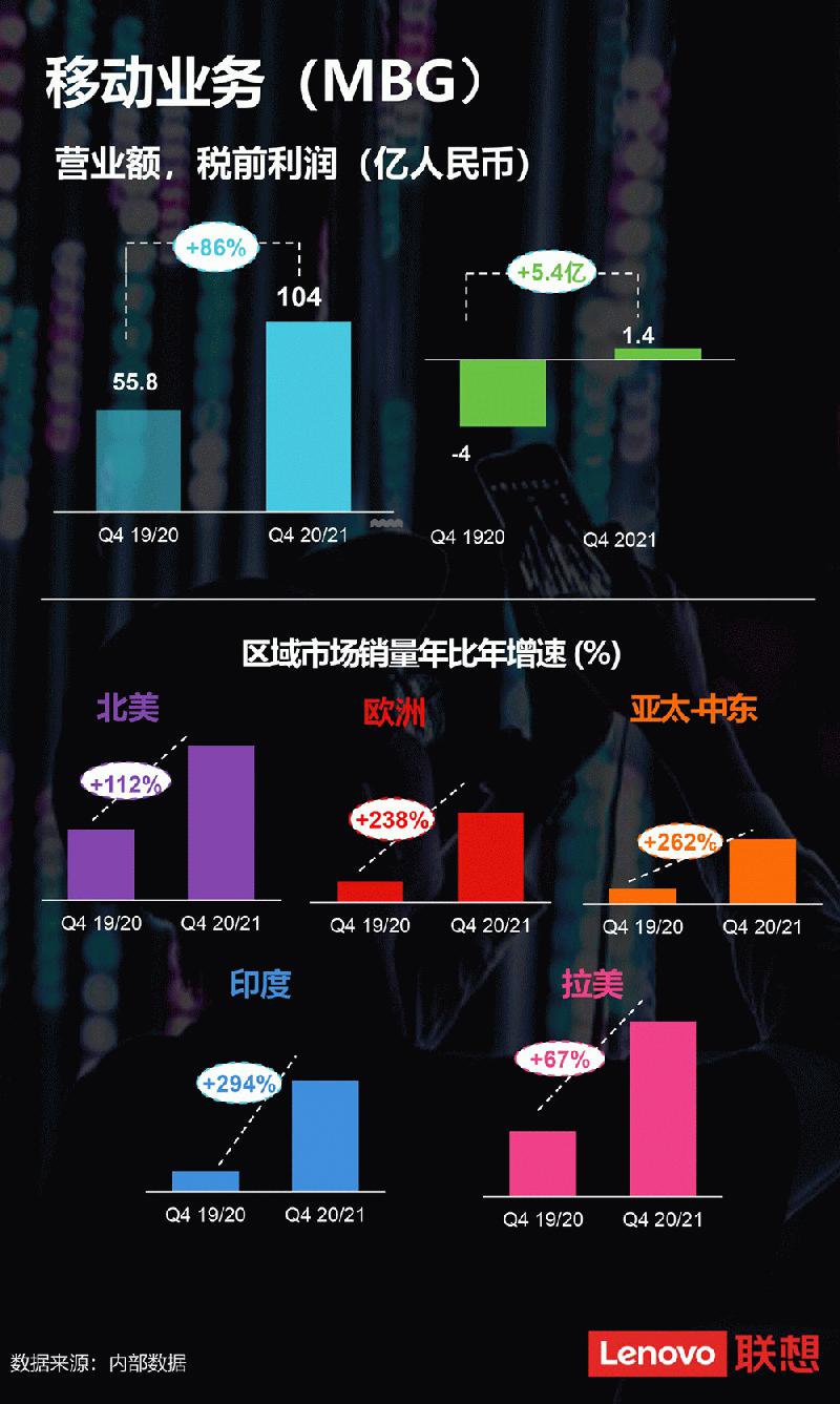 2020/21财年第四季度,联想集团移动业务迅速从疫情影响下恢复,盈利性增长的势头持续显现,税前利润达到1.4亿人民币,创造了并购摩托罗拉移动以来的新高。整体营业额年同比猛增了86.4%。通过推出5G系列等强大的产品组合,并持续拓展运营商合作关系,移动设备销量在多个市场都实现了年同比三位数的高增长,北美增长111.8%,欧洲市场增长238.3%,亚太市场增长261.6%,印度市场增长294.2%。另外在优势市场拉美地区,联想智能手机继续取得良好市场表现:在阿根廷、巴西和墨西哥这三个主要市场中继续位居前列,其中在墨西哥市场为出货量市场份额第一,而联想在整个拉丁美洲的销量份额首次突破20%,达到20.9%的历史新高。