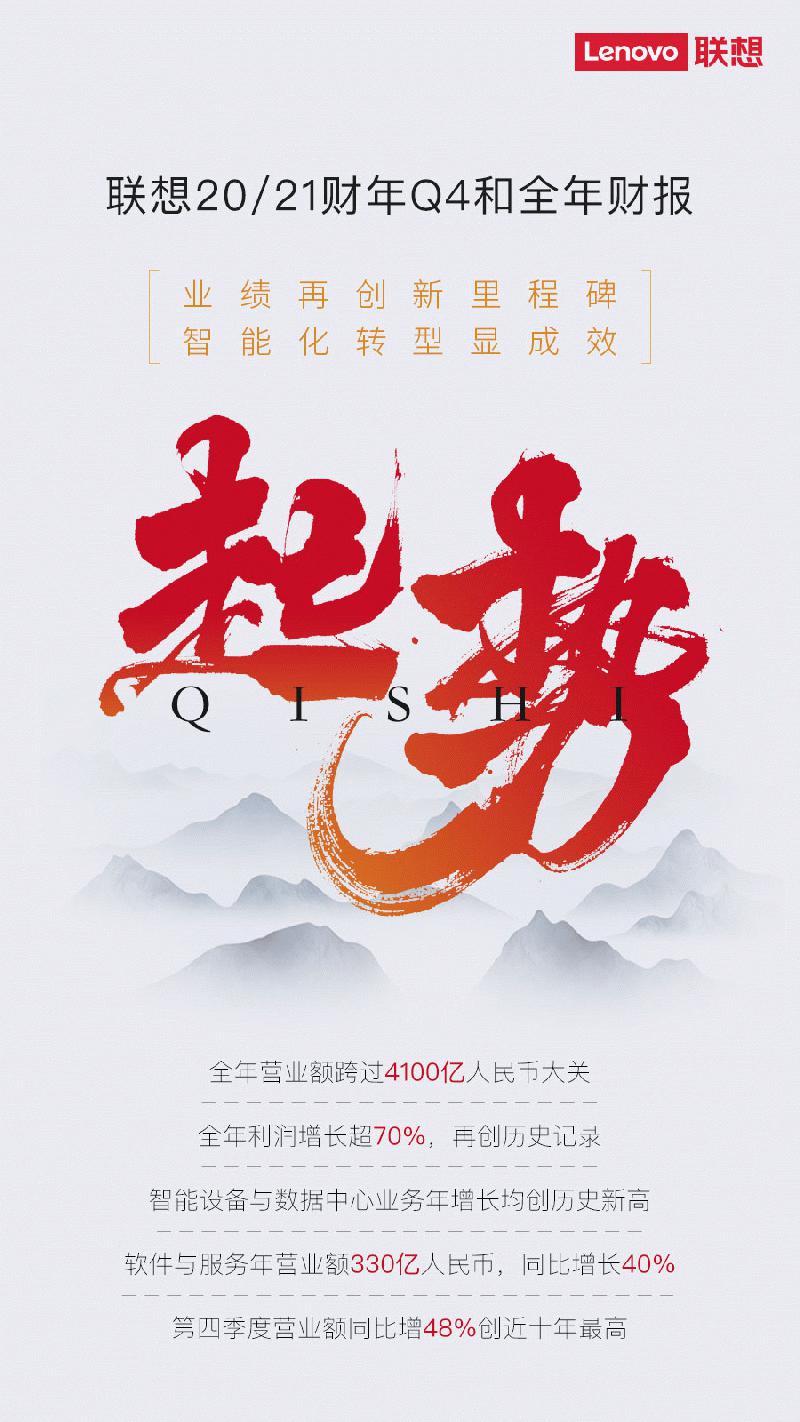 5月27日,中国数字经济领导企业联想集团公布截至2021年3月31日的2020/21财年第四财季及全年业绩:全年整体营业额在一年内飙升近700亿人民币,同比增长19.8%,达到4116亿人民币的新里程碑;税前利润120亿人民币,净利润近80亿人民币,年同比增长均超过70%。其中,第四财季营业额达到了1060亿人民币,同比增长48%,创造了近十年以来最快增速。税前利润25.8亿人民币,净利润17.6亿人民币,分别达到了上一财年的5倍和6倍。