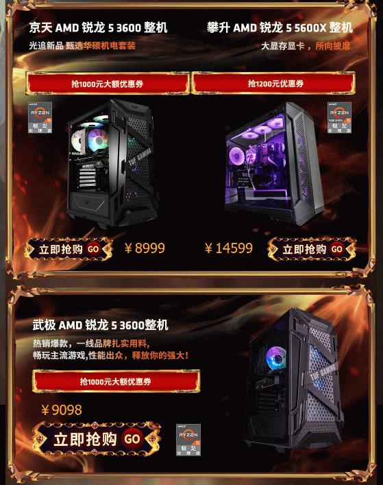随着六月份的到来,最为火热的年中大促现已正式开启了。各大DIY硬件厂商都在电商开展了各种各样的活动,作为全球知名芯片厂商AMD(超威)就在京东自营旗舰店和天猫官方旗舰店开展了一系列回馈粉丝的促销,尤其是整机类型的产品今年参与的型号非常多,这也得益于AMD和品牌装机商的合作越来越深入。下面就为广大DIY玩家介绍一下两个旗舰店的重点活动。