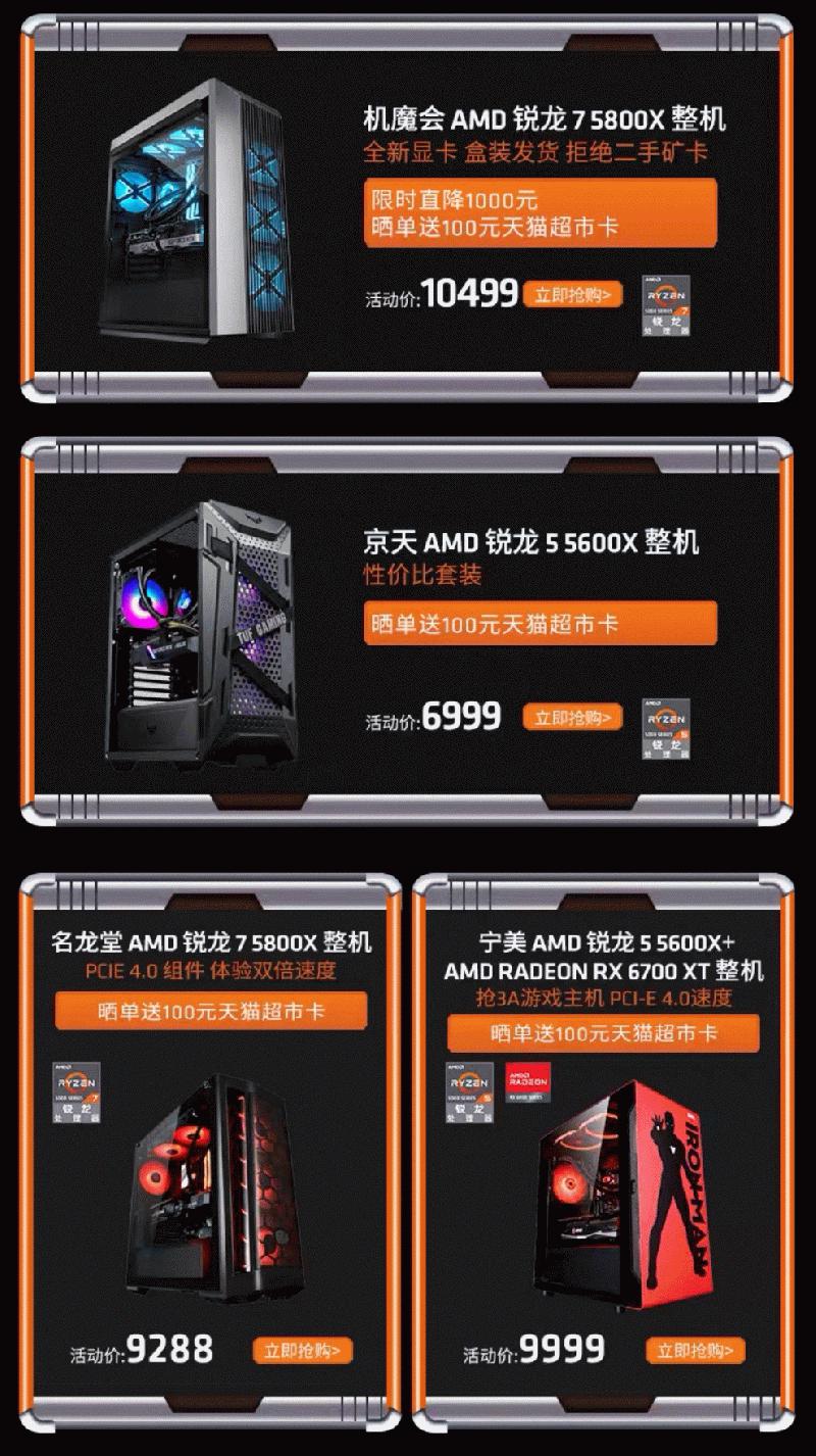 AMD天猫旗舰店的整机活动涉及的品牌更多一些,活动时间仅限6月16日到6月18日,指定型号整机限时直降,同时部分机型晒单还送天猫超市卡。