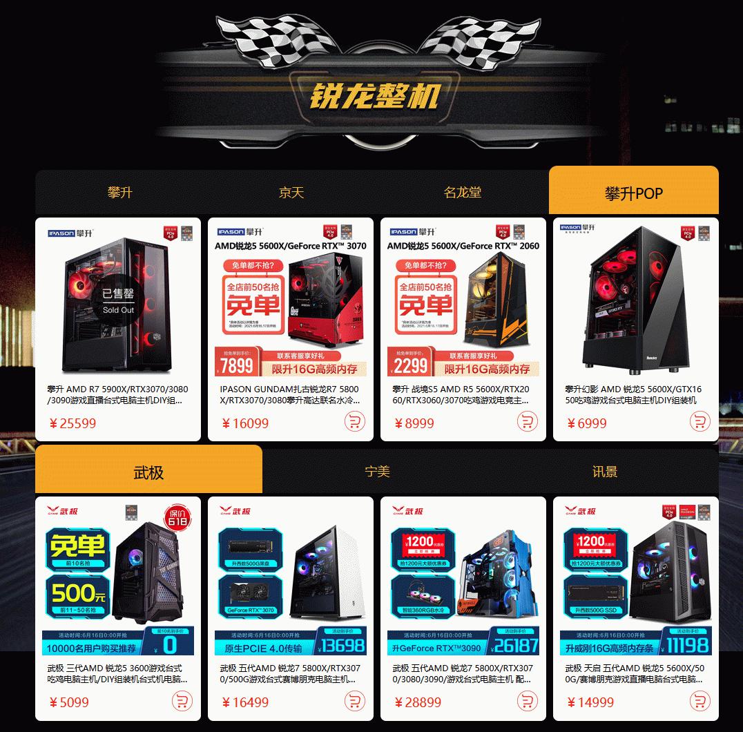 本次活动还准备了多款锐龙5000系列处理器为核心的整机产品,来自京天、武极、攀升、宁美、名龙堂和讯景的整机产品一定可以满足广大DIY玩家的各种使用需求。