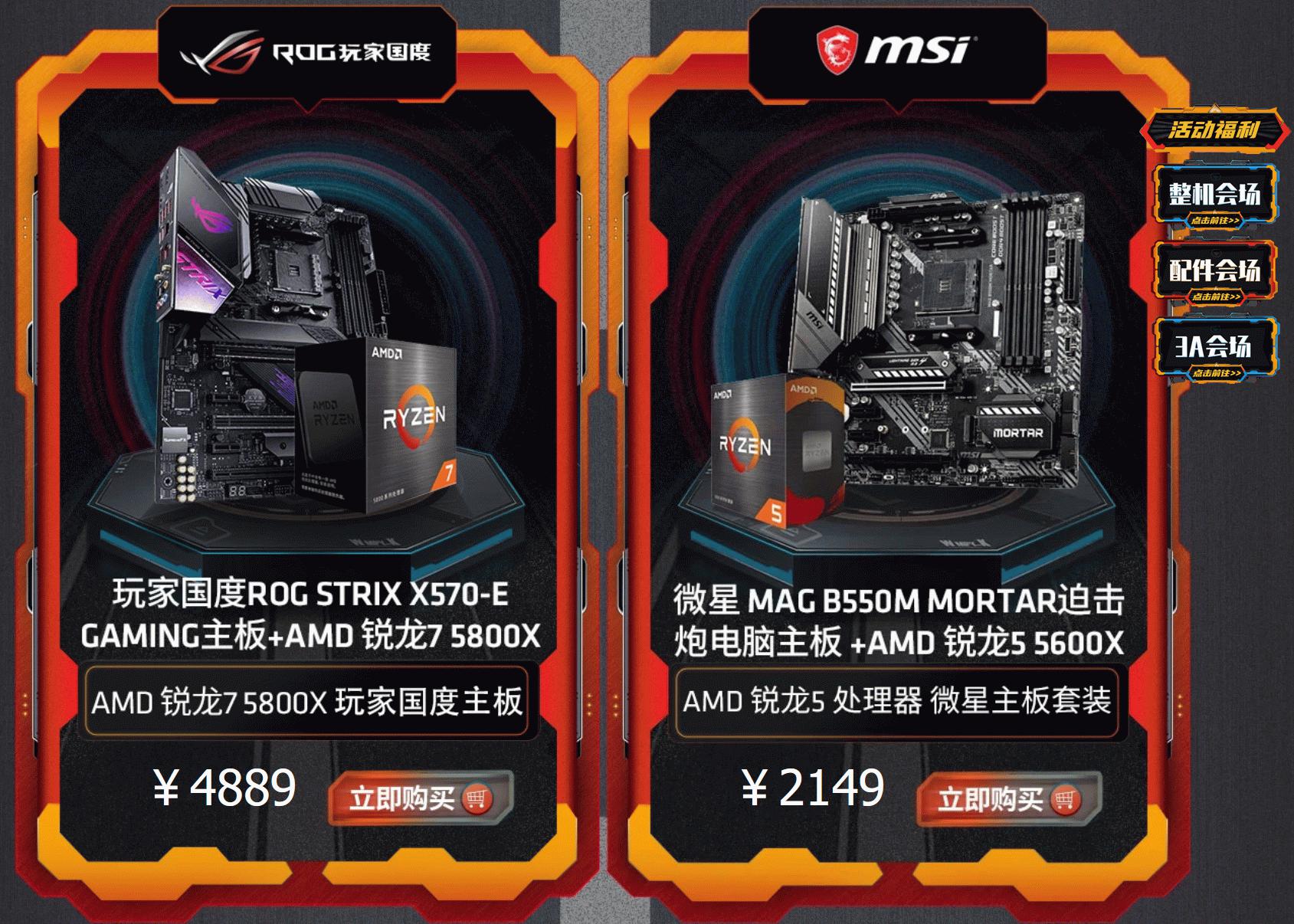 活动中同时准备了各大品牌的板U套包,无论您心仪华硕、微星、七彩虹还是华擎主板搭配AMD锐龙处理器都是更加超值的选购方案。