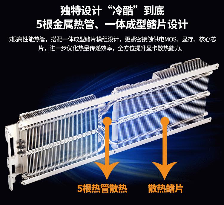 在散热设计上,昂达RTX3060神盾12GD6采用热管直触设计,5根高性能热管搭配一体成型鳍片模组设计,更紧密接触供电MOS、显存、核心芯片,全方位优化热量传递效率,散热能力更胜一筹。同时,显卡还配备了一体式阳极铝金属强化背板,可以有效保护PCB。背部大面积的镂空风道,可以令鳍片上的热量被快速带走,有效地增强散热效率。