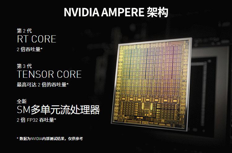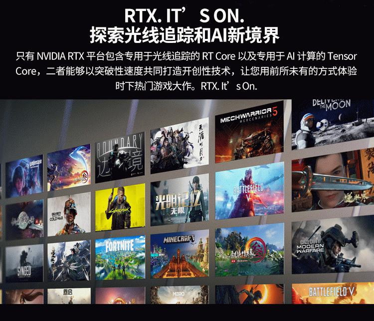 相较于上一代RTX架构,NVIDIA Ampere架构在算力上有着成倍的增长,第二代RT Core不仅提升了2倍性能,更增加了对游戏中运动模糊部分场景的光线追踪计算加速。全新Tensor Core,可在不损失画质的前提下,大幅提升游戏帧率。全新的RTX光线追踪技术、DLSS 2.0(深度学习超级采样),将视觉保真度提升至全新高度,令新时代的光追游戏运行更顺畅,画质更精湛。