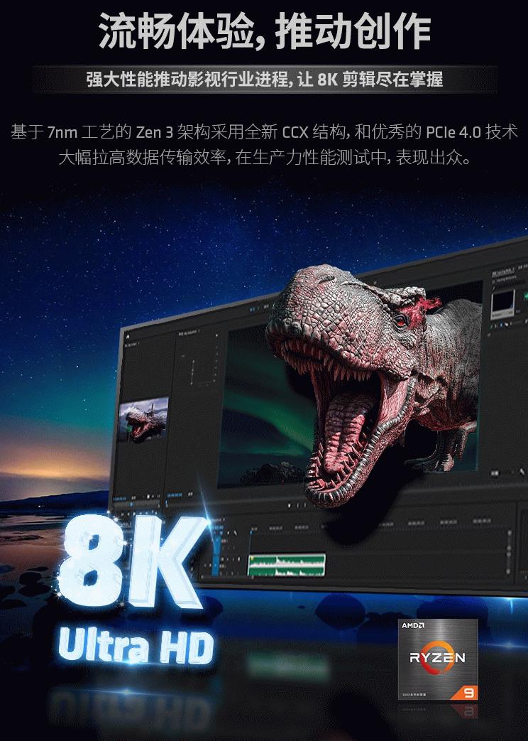 AMD锐龙7 5800X处理器优秀的CCX结构以及出色的单/多核性能,是推动影视行业进程的强大助力,让8K剪辑尽在掌握。即便同时运行多个大型生产力软件也毫无压力,让内容创造者灵感不断,效率倍增,从而获得最完美的体验。