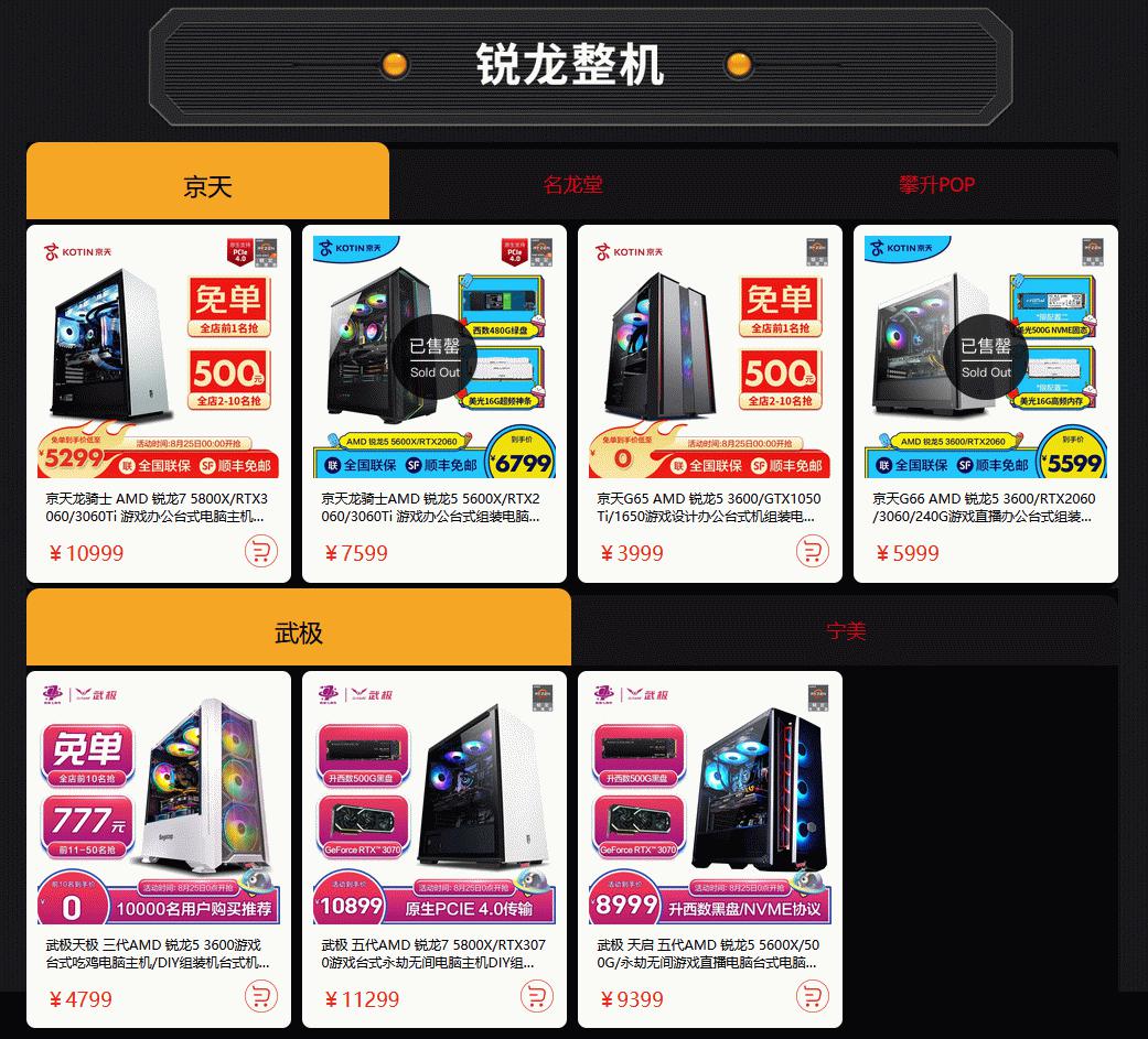 产品部分,活动页面上首先推荐的当然是重磅新品和镇店爆款了,月初上市的AMD锐龙5000G台式处理器的两款新品货源充足,收获了DIY玩家们的一致好评;而镇店爆款的四款锐龙5000处理器,每一款都在其对应的市场无人可敌,成为了最畅销的产品,这些人气处理器均享受白条6期免息的优惠。
