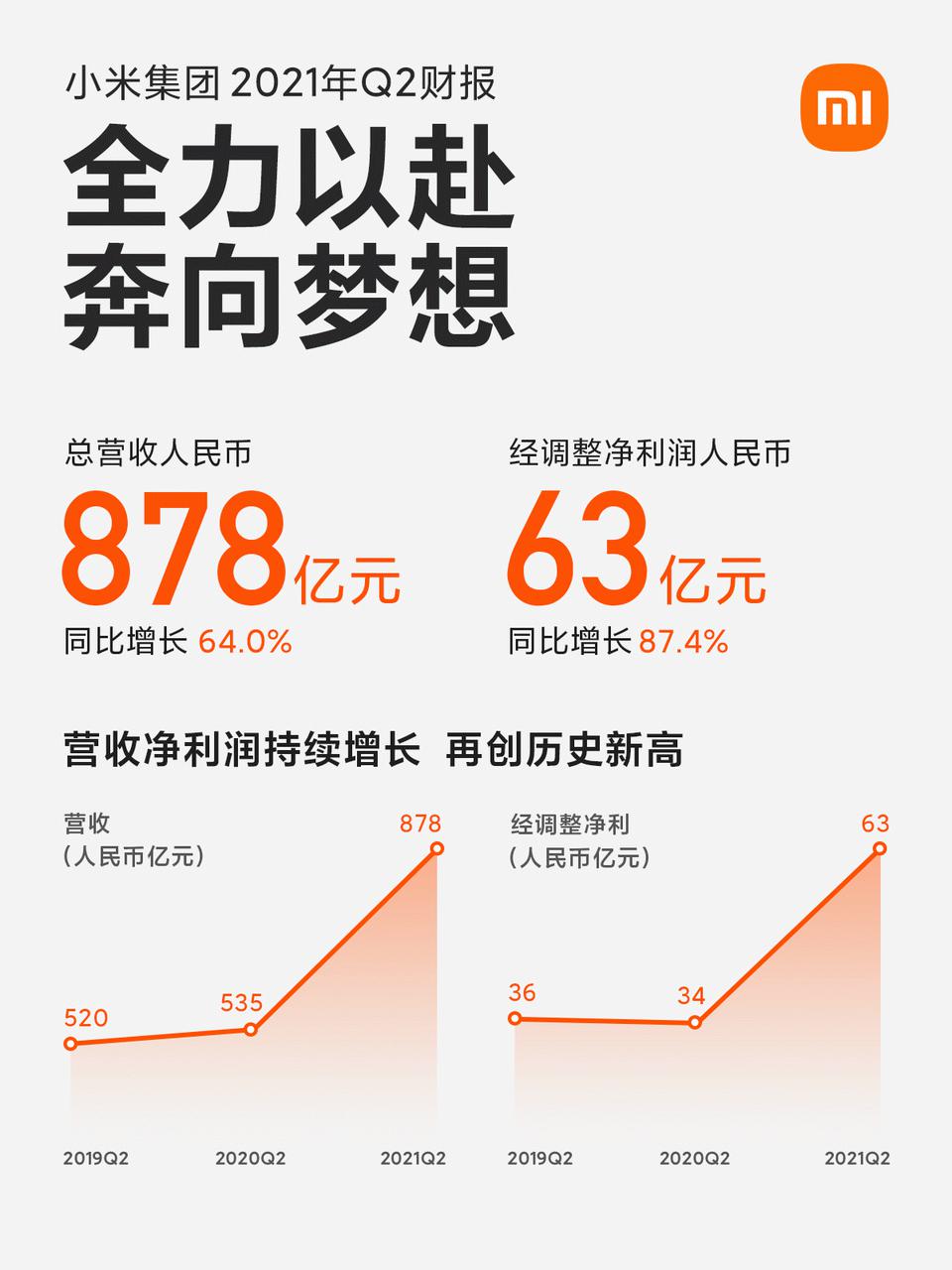 小米发布了2021年Q2业绩:总收入878亿,增长64%;净利润83亿,增长83%;经调整净利润63亿,增长87%。现金储备1116亿元。本季度研发费用31亿,增长56.5%。智能手机首次晋升全球第二,MIUI全球活跃用户达到4.54亿,小爱同学月活用户首次超过1亿,小米电视连续10个季度中国第一。
