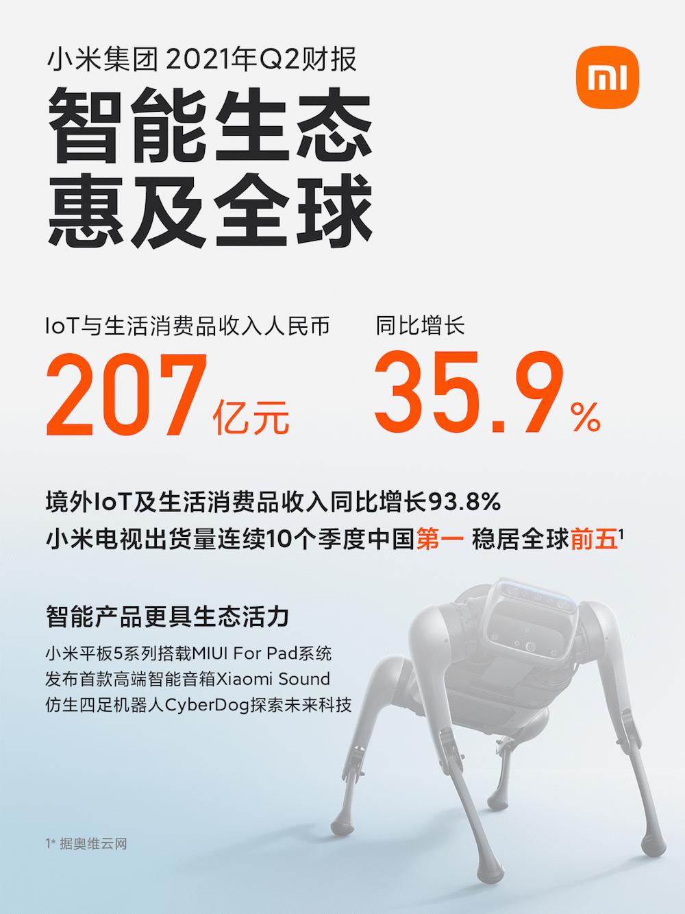 小米电视连续十个季度中国第一:2021年Q2,小米IoT与生活消费品收入人民币207亿元,境外IoT与生活消费品收入同比增长高达93.8%。小米电视出货量连续10个季度保持中国第一。我们的智能产品更加具有生态活力。