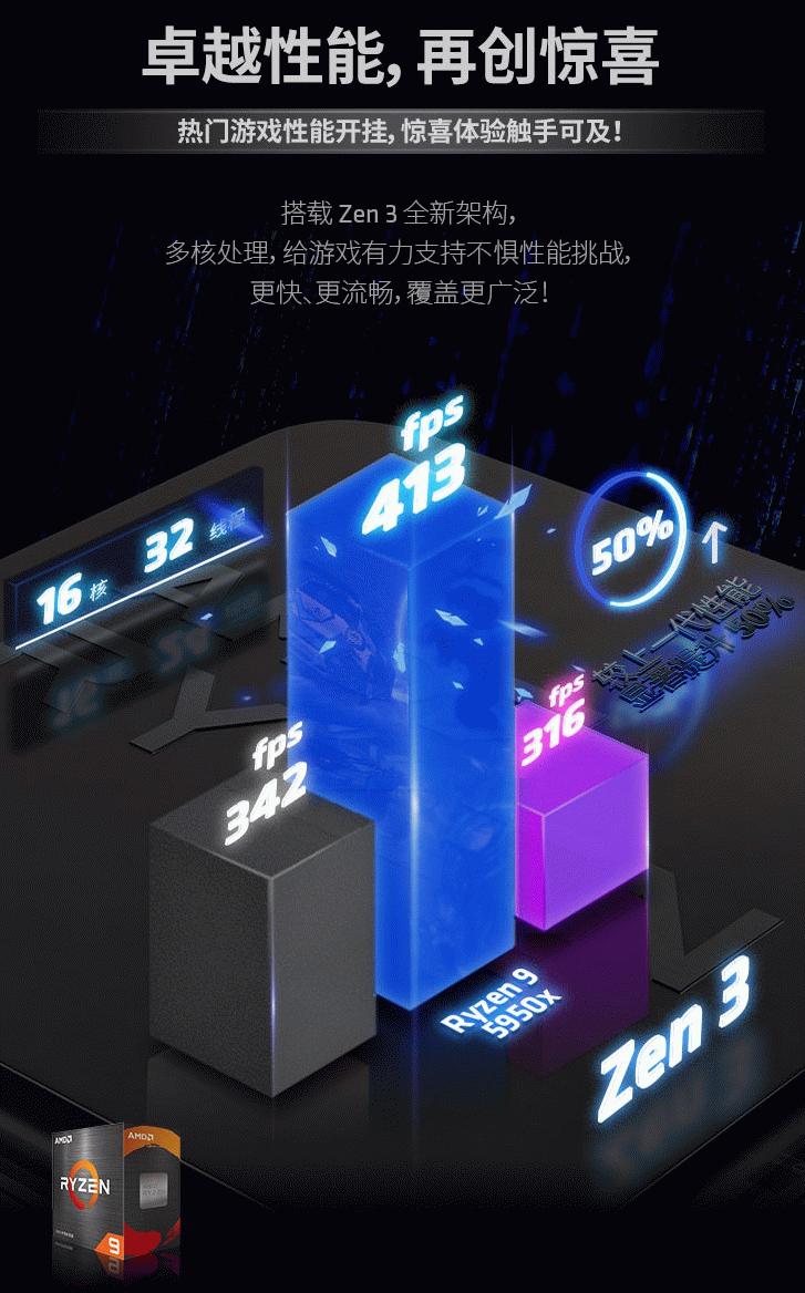 游戏方面AMD锐龙9 5950X也毫不逊色,16核心32线程的高规格配置,让游戏时刻保持流畅运行的同时还可以拥有更多后台软件体验,无论是直播录屏,语音互动,还是对录好的游戏视频进行后台处理,都让玩家们大呼完美而72MB的游戏高速缓存让您彻底告别卡顿掉帧,拥有极致的沉浸式游戏体验。