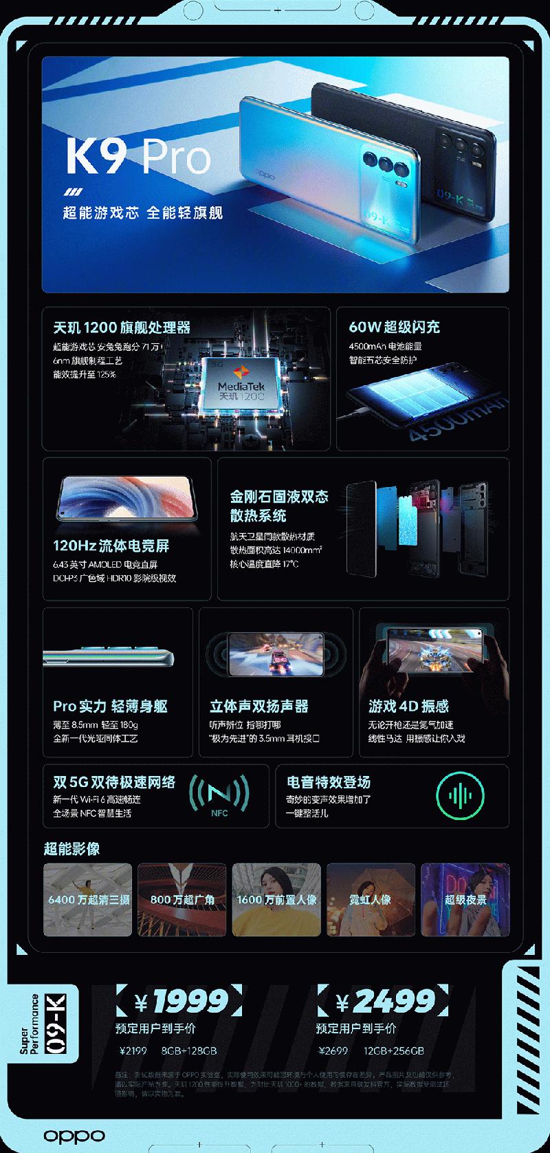 K9 Pro采用刷新率高达120Hz的AMOLED高清大屏,屏占比91.7%。支持100% DCI-P3广色域、HDR10。整机重约180g左右,厚度仅有8.5mm左右。搭载旗舰级5G处理器天玑1200,配备超级闪充60W和4500毫安的大电池。内置两片大尺寸石墨散热片,并优化创新石墨烧结工艺,散热效果提升了30%。后置6400W主摄+800W超广角+200W微距的三摄组合,支持6400W像素直出。前置摄像头配备1600万像素的高清摄像头,支持AI焕采美颜2.0,自拍更加生动自然。网络方面支持全新的Wi-Fi 6技术,网速更快更稳定。双5G以及Smart5G技术,4G、5G网络智能无感切换。具备全功能NFC,无论乘地铁公交、移动支付还是开门禁,NFC轻松一碰便能搞定。