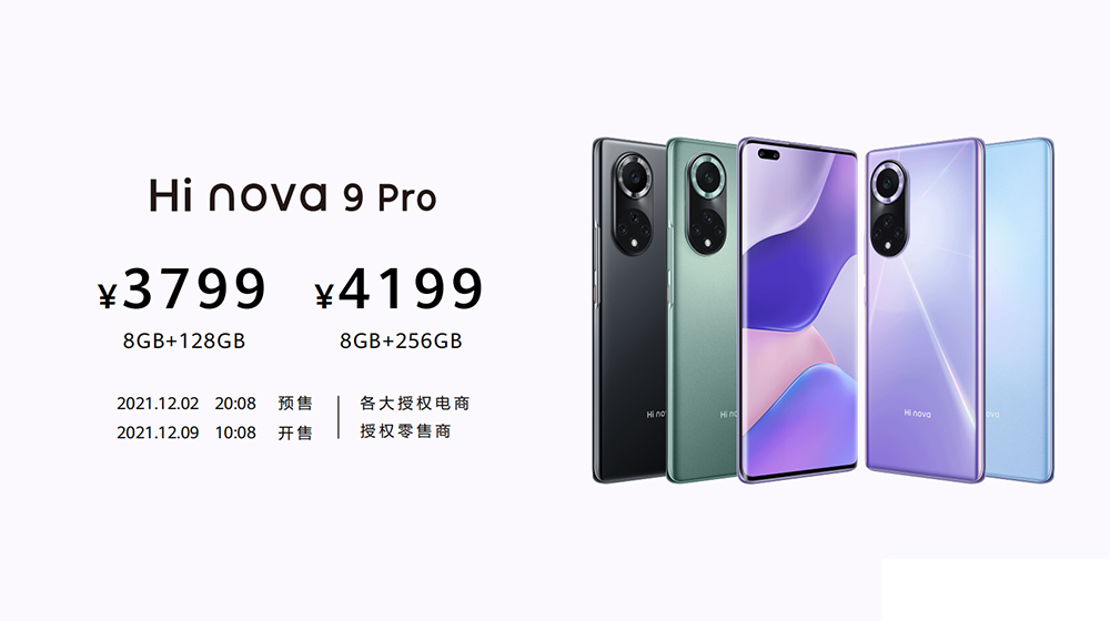 Hi nova 9/Pro系列将于12月2日开启预售,12月9日10:08正式开售。Hi nova 9售价为(无充电器):8GB+128GB版本2999元;8GB+256GB版本3399元。Hi nova 9 Pro售价为(有充电器):8GB+128GB版本3799元;8GB+256GB版本4199元。