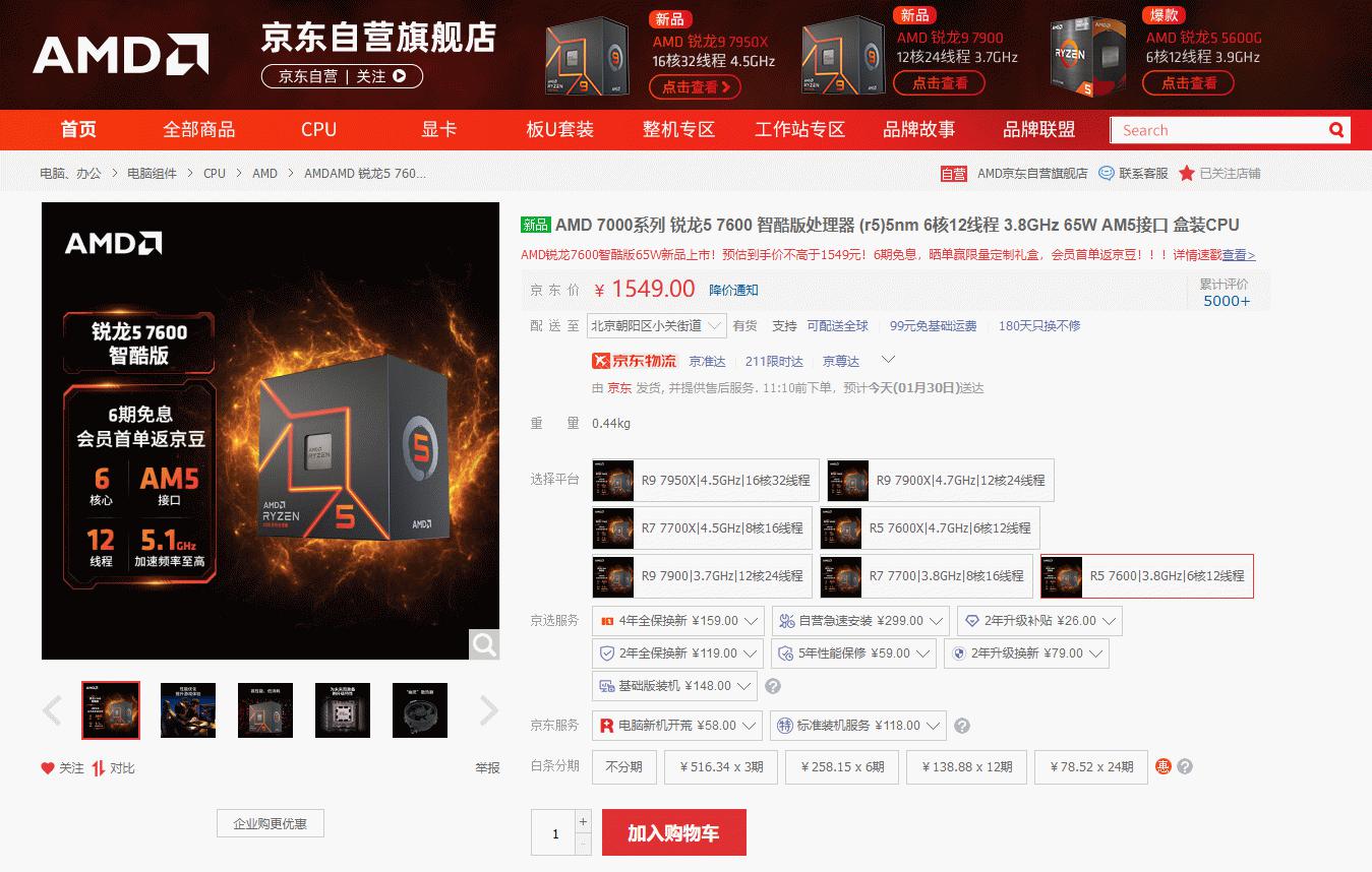 AMD 锐龙5 7600京东购买链接: