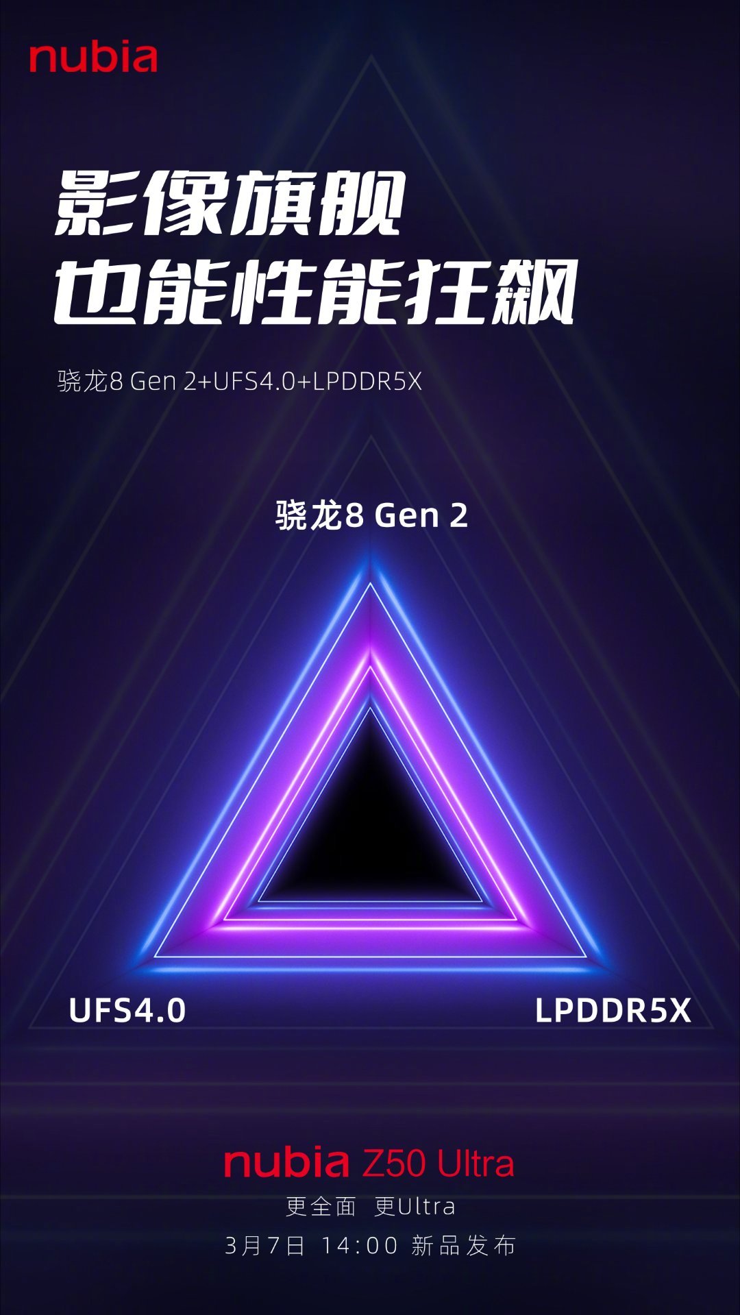 努比亚Z50 Ultra搭载骁龙8 Gen2+LPDDR5X+UFS 4.0