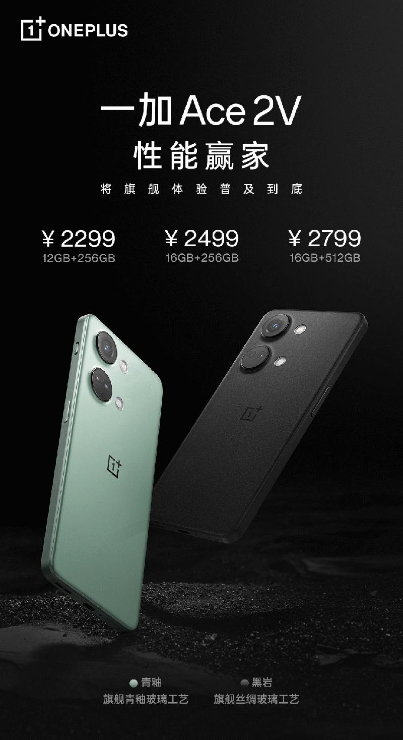 3月7日,一加Ace 2V正式发布,青釉、黑岩双色可选。12+256GB售价2299元;16+256GB售价2499元;16+512GB售价2799元。