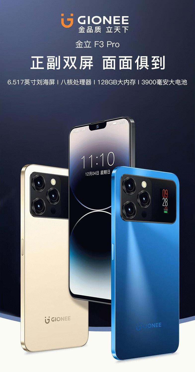 近日,金立手机新机金立F3 Pro上架电商平台,金色、晨曦蓝、水墨黑三色可选,8GB+128GB售价1399元。F3 Pro后盖镜头模组边配有一块副屏,可显示时间、消息、来电等信息。正面采用6.5英寸刘海屏,支持阳光屏和无级色温调节。搭载展讯T610处理器,后置2100万像素镜头,前摄为500万像素。支持4G全网通、立体双扬声器等。内置3900mAh电池,支持10W Type-C充电。