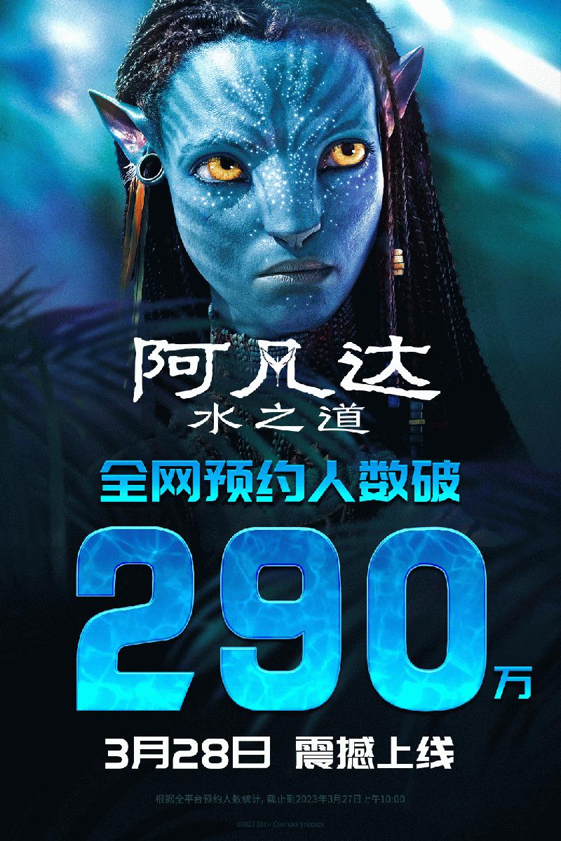 《阿凡达2:水之道》将于3月28日下午4点全球同步上线视频平台。国内包括腾讯、爱奇艺、优酷等都上线了预约界面。目前,《阿凡达2》全网预约量已经突破了290万。