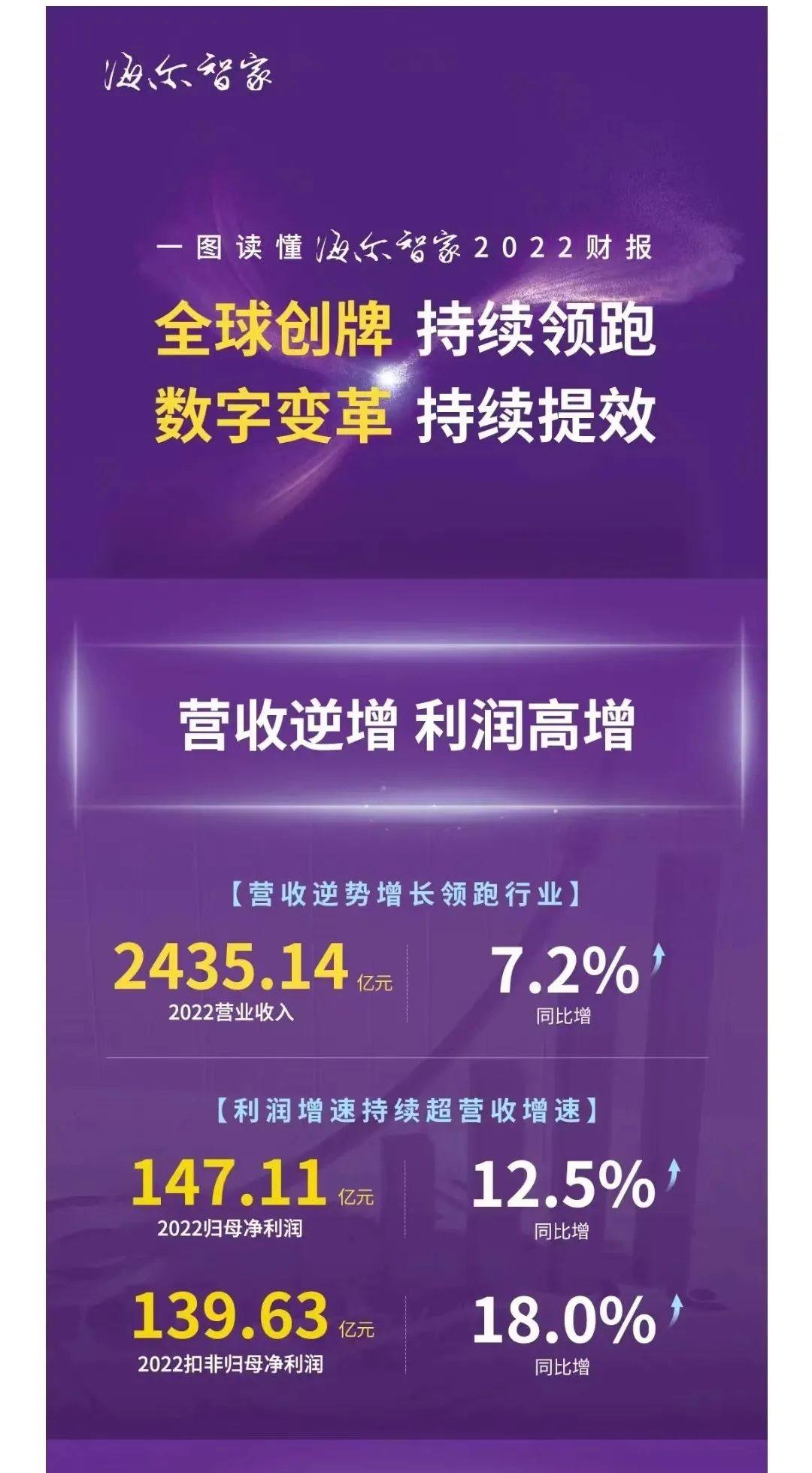 3月30日晚间,海尔智家发布了2022年财报。财报显示,2022年海尔智家实现收入2435.14亿元,同比增长7.2%;归母净利润147.11亿元,同比增长12.5%,扣非归母净利润139.63亿元,同比增长18%,利润增速持续超营收增速。