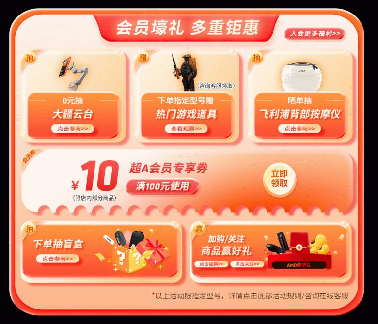 为了能够更好地参与此次618促销活动,首先建议大家成为AMD京东自营旗舰店的会员,加入会员即可领取超A会员专享优惠券,加购/关注商品赢好礼,会员首次下单即返1000京豆,还能0元抽大疆云台等多种礼品。下单指定产品赠送热门游戏道具,不仅可以享受京东白条多期免息还能直接抽盲盒,收到商品后参与晒单活动还能抽飞利浦背部按摩仪等多种好礼。相信看到这些种类繁多的活动,DIY用户们已经感受到了AMD的诚意。