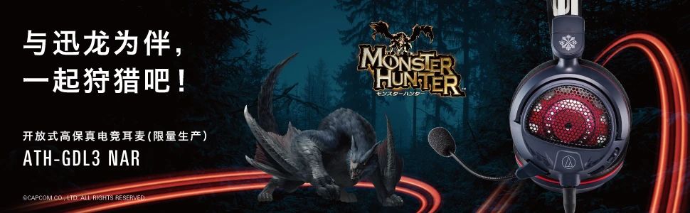 ATH-GDL3 NAR 采用鐵三角的电竞游戏耳机"ATH-GDL3 "硬件平台,以《怪物猎人》系列中敏锐的赤眼凶兽 "迅龙"为元素设计。