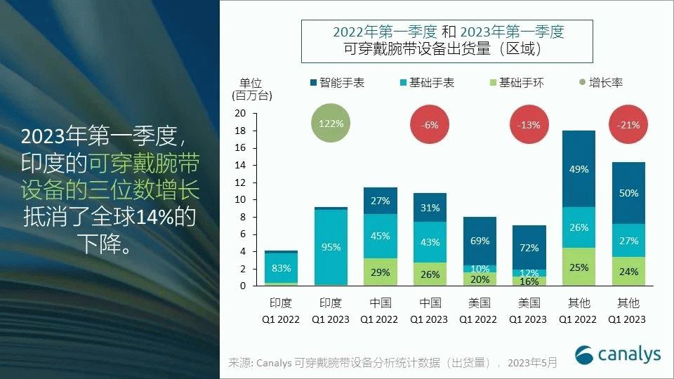 6 月 6 日消息,根据市场调查机构 Canalys 公布的最新报告,2023 年第 1 季度全球可穿戴腕带设备出货量为 4100 万台,同比下降 1%。印度市场却一枝独秀,同比增长 122%,抵消全球 14% 的年下滑幅度。