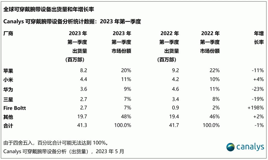 2023Q1 全球可穿戴腕带设备报告:苹果领衔、小米第二、华为第三