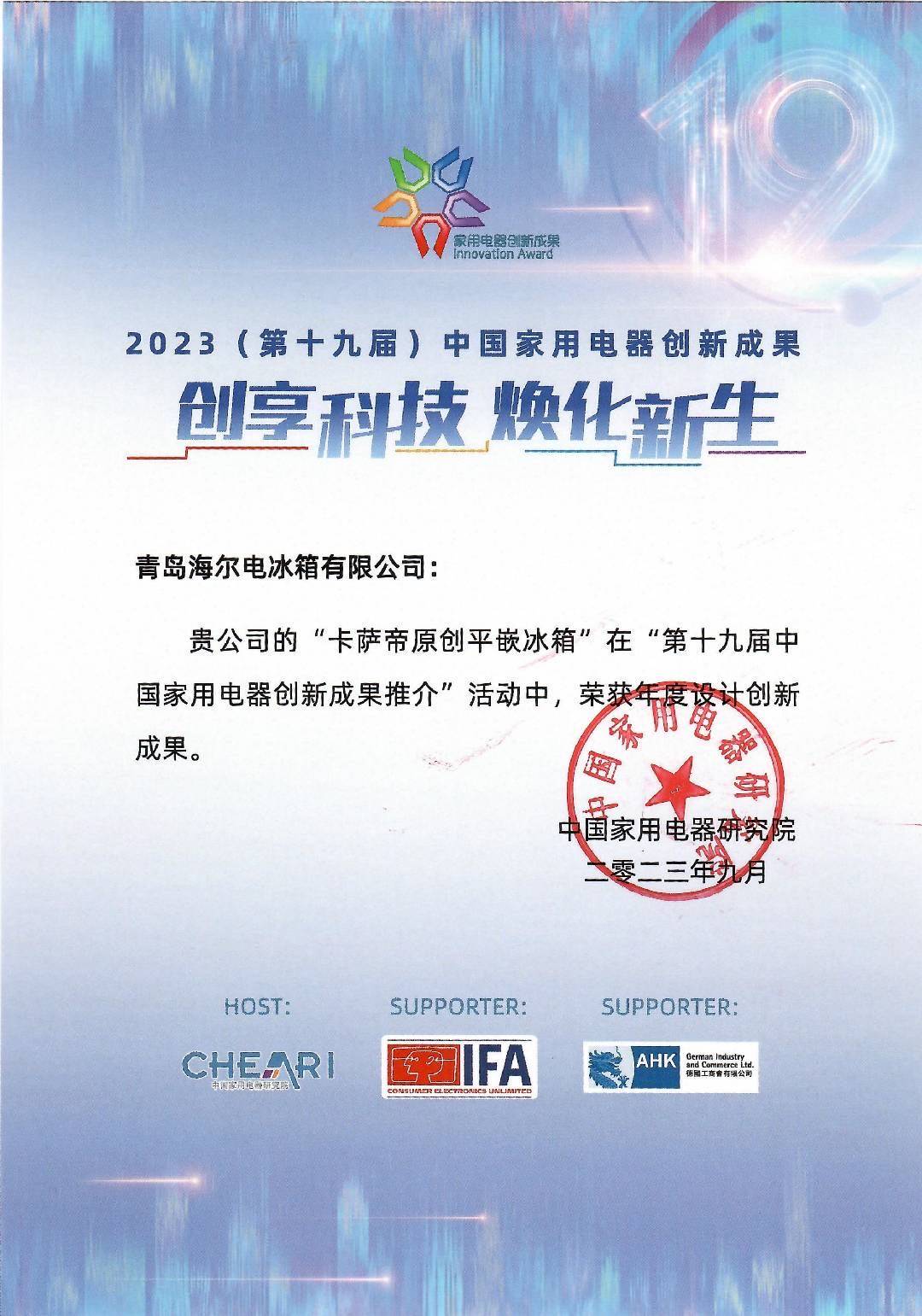 海信璀璨全套系厨电产品入围AWE艾普兰奖,获得家电与消费电子领域最具影响力和公信力的产品评选荣誉。作为国家洗碗机品牌代表、国家标准修订工作组成员,海信厨卫参加了全国家用电器标准化技术委员会组织召开的GB/T 20290《家用电动洗碗机性能测试方法》国家标准修订会议。同月首届CIC中国智慧生活大会在京召开,海信油烟机·璀璨的CXW-230-HQ709C2作为“智能化”及“绿色低碳”的代表性产品,成功入选“智慧生活科技好物-智慧家居”选购指南。