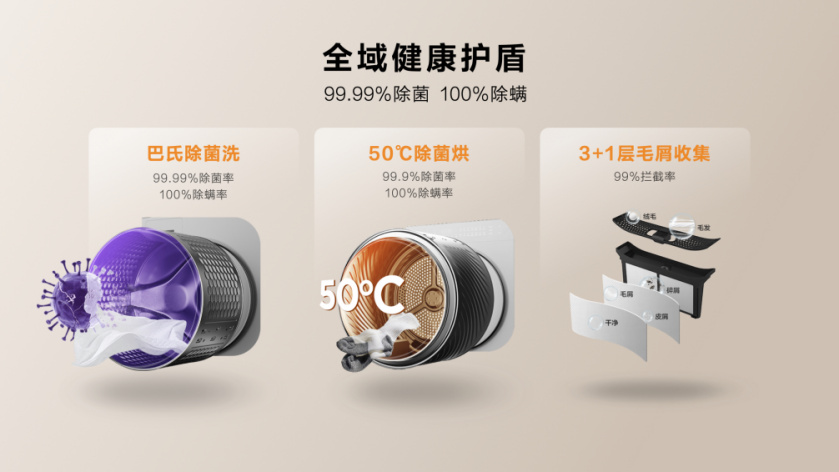健康是消费者永恒的追求,而用户的需求就是企业的使命,TCL 双子舱T10精心配置巴氏除菌洗、50℃高温除菌烘、3+1层毛屑收集等众多健康功能,达到99.9%除菌率、100%除螨率和99%拦截率,营造洁净空间,守护全家安全。