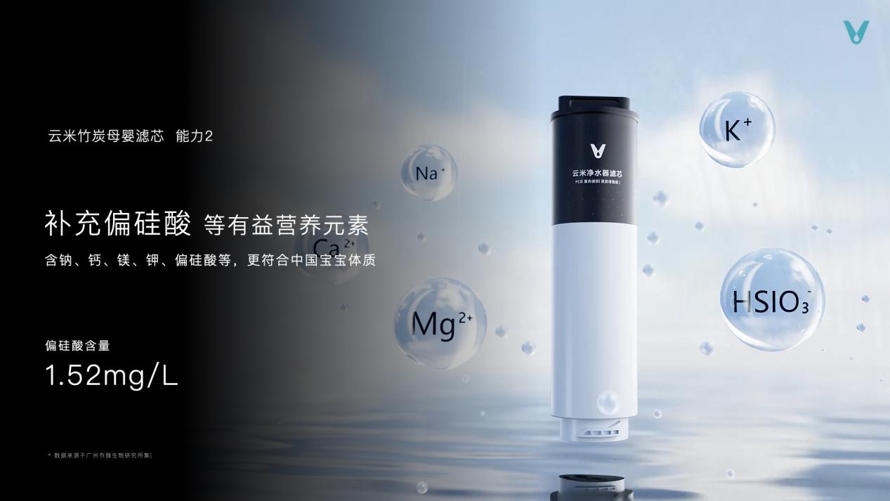 针对以上痛点,云米推出了全新产品Super 2 1200G AI净水器,一台专为母婴家庭定制的净水器,搭载了行业首创的竹炭母婴滤芯,有效滤除水中有害物质,为母婴的健康饮水用水保驾护航。据介绍,领先行业的竹炭滤芯技术具备三大能力,一是在过滤中补充有益营养元素“偏硅酸”, 被称为“水中黄金”,让宝宝在喝水中吸收营养;二是净水器消毒副产物三氯甲烷去除率高达99.9%,能够大幅消除威胁人体健康的有害消毒副产物,三是能够吸附水中氯化物、铁锈、泥沙异味,从而改善饮用口感,使得水更加清甜,让宝宝爱上喝水;