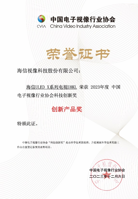12月6日,由中国电子视像行业协会主办的2023(第19届)中国音视频产业大会(AVF)暨“科技创新奖”颁奖礼在北京举行。海信电视U8、海信可折叠激光电视L5K同时荣获中国音视频领域最权威奖项——“2023年中国电子视像行业协会科技创新奖—创新产品奖”。