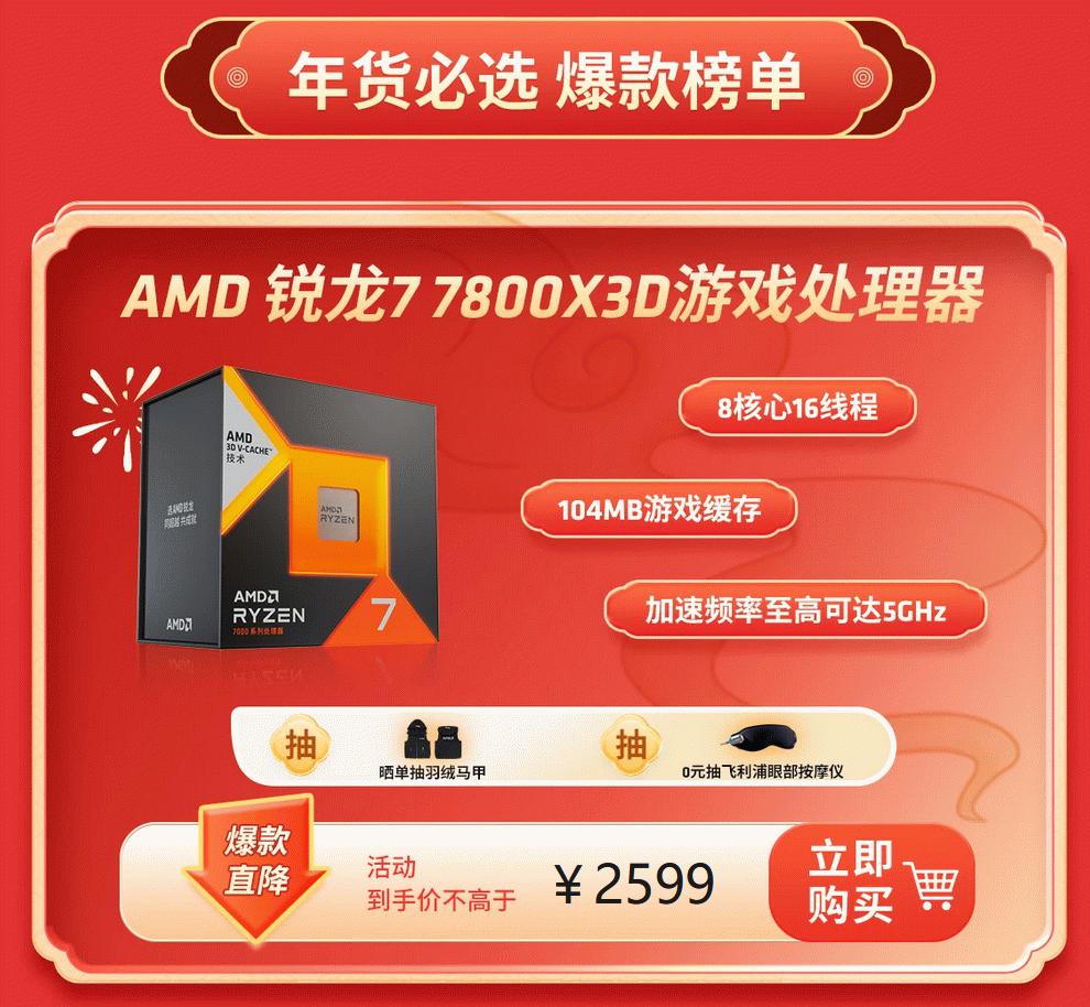 此次活动中的大爆款CPU非 AMD 锐龙7 7800X3D处理器莫属了,活动到手不高于2599元;其次是AMD 锐龙5 7500F处理器,到手不高于1149元。这样的报价加上丰富的会员活动内容,绝对值得玩家们下单了。