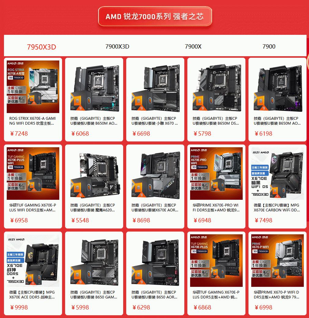 当然还有AMD锐龙7000/5000处理器的套装,这些搭配了华硕、微星、华擎、映泰、铭瑄、昂达和技嘉主板的板U套装直降,还有多款低价B650芯片组主板上新,更多超值搭配还请朋友们前往活动页面挑选。