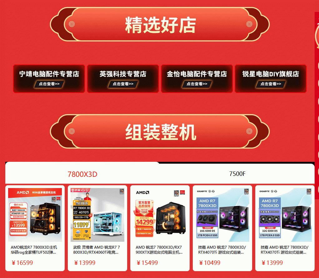 对于不熟悉DIY的朋友们也可以直接在活动页面选购一台AMD整机,这些ESI合作伙伴以AMD锐龙处理器为核心打造的整机都各具特点,可以满足不同人群的使用需要,感兴趣的用户可以直接到对应的整机专营店挑选。此次活动中还有多款AMD Radeon RX 7000/6000系列显卡,目前货源充足而且价格也非常稳定。活动页面另外还有内存、SSD和其它电脑组件产品,想要一站式搭配好整机的朋友们直接在活动页面就能选购了。