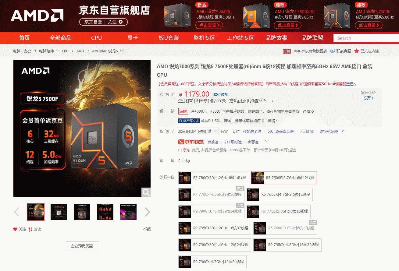AMD 锐龙5 7500F京东购买链接: