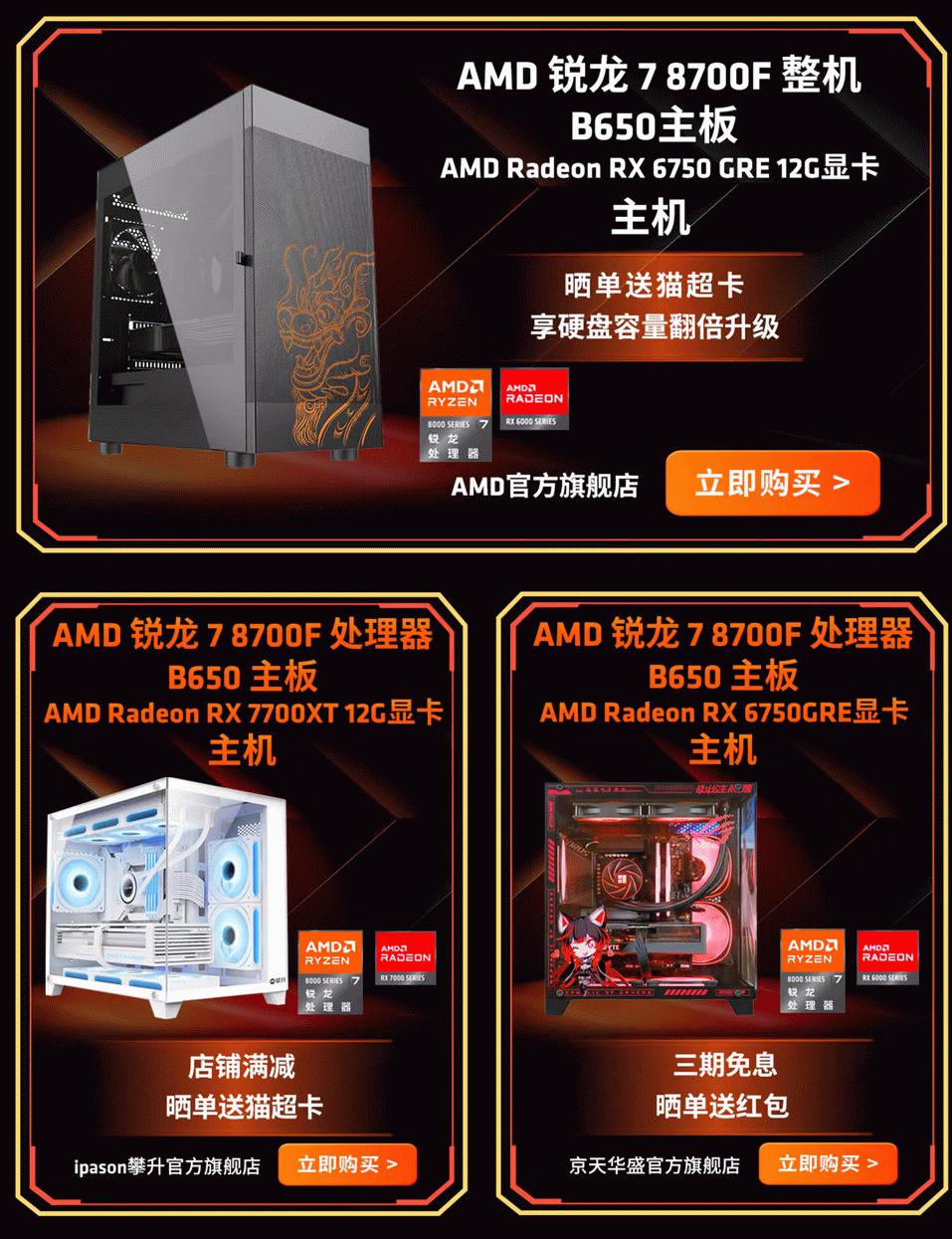 AMD 锐龙7 8700F 整机 3A配置晒单可获得价值150元猫超卡;2A配置晒单可获得价值100元猫超卡。
