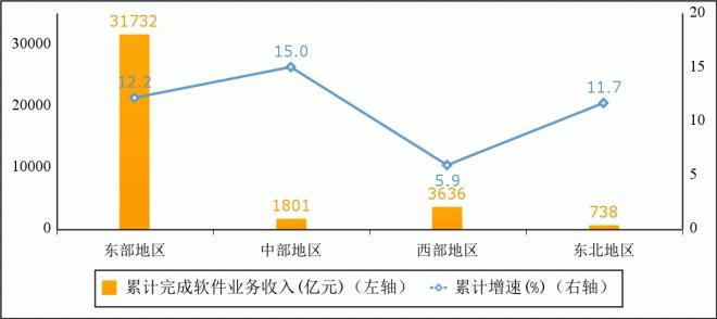 中西部地区软件业务收入增速加快。1-4 月份,东部地区完成软件业务收入 3.2 万亿元,同比增长 12.2%,增速较一季度回落 0.6 个百分点;中部地区完成软件业务收入 1801 亿元,同比增长 15%,增速较一季度提高 2.7 个百分点;西部地区完成软件业务收入 3636 亿元,同比增长 5.9%,增速较一季度提高 1 个百分点;东北地区完成软件业务收入 738 亿元,同比增长 11.7%,增速较一季度回落 0.7 个百分点。四个地区软件业务收入在全国总收入中的占比分别为 83.7%、4.8%、9.6% 和 1.9%。