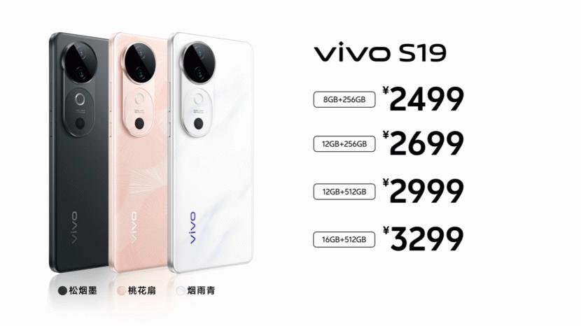 本次发布的vivo S19系列共有烟雨青、桃花扇、千山翠、松烟墨、剑影灰五款全新配色。其中,vivo S19 8GB+256GB版售价2499元,12GB+256GB版售价2699元,12GB+512GB版售价2999元,16GB+512GB版售价3299元;vivo S19 Pro 8GB+256GB售价3299元,12GB+256GB版售价3499元,12GB+512GB版售价3799元,16GB+512GB版售价3999元。