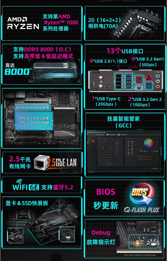 技嘉X670 AORUS ELITE AX小雕主板采用了ATX大板规格,配备了16+2+2相数字供电设计,支持DDR5内存,频率可高达8000MHz(OC),为用户提供极致的内存性能。主板上有4个DDR5 DIMM插槽,可支持高达192GB的内存容量(单一插槽支持48GB容量)。存储扩展方面,主板提供了多个M.2插槽和SATA接口。在接口方面,主板提供了多个USB 3.2接口、USB Type-C接口以及HDMI接口等,方便用户连接各种外部设备。