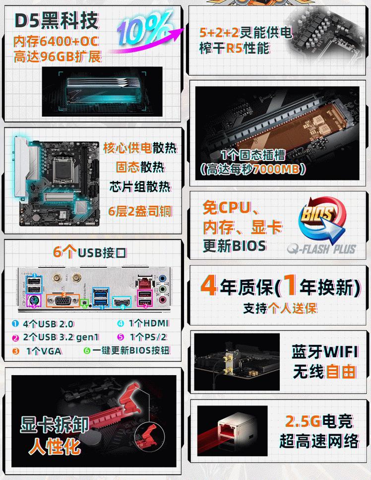 技嘉B650M GAMING WIFI 白魔鹰主板采用5+2+2相供电设计,支持最新的DDR5内存技术,频率可高达6400MHz(OC)。主板提供了M.2接口(支持NVMe协议),方便用户接入高速SSD固态硬盘。主板提供了多个USB接口(包括USB 2.0、USB 3.2 Gen 1和USB 3.2 Gen 2等),以及HDMI、VGA等视频输出接口,满足用户多样化的连接需求。主板在散热设计上也下足了功夫,它采用核心供电散热、固态散热和芯片组散热三重散热系统,确保主板在高负荷运行时依然能够保持稳定。