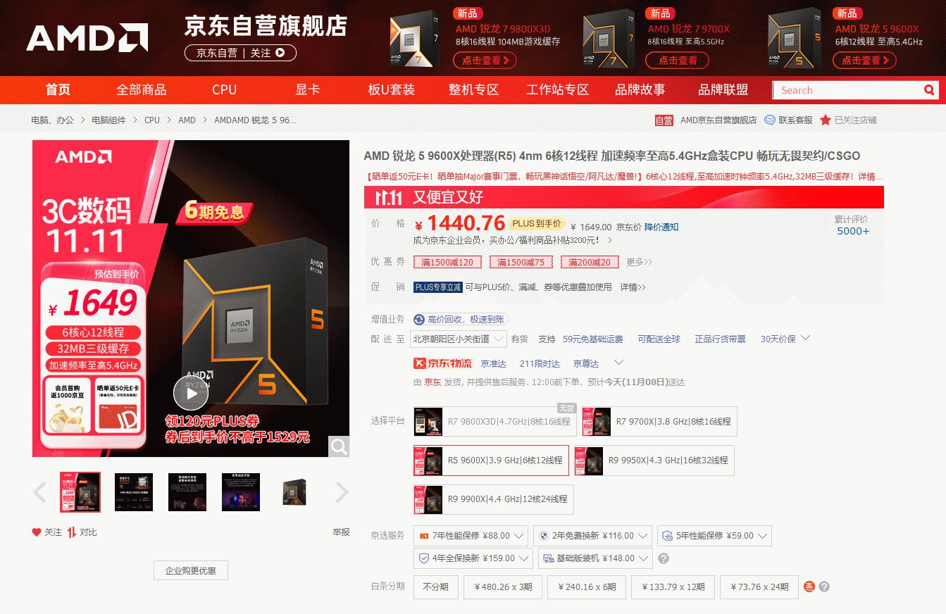 超级补贴现神价!AMD 锐龙5 9600X京东11.11史低推荐