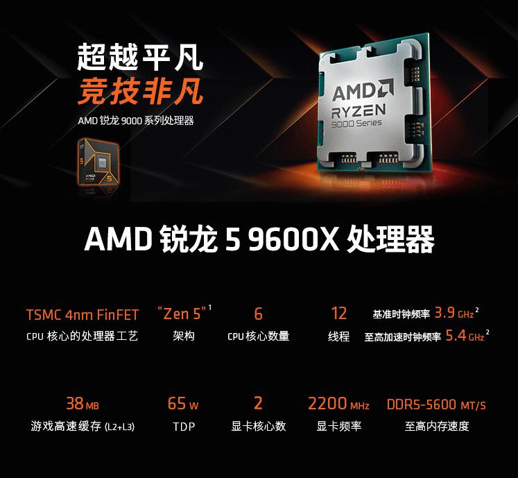 AMD 锐龙5 9600X处理器采用了TSMC 4nm FinFET工艺制程的ZEN5架构,搭配6核心12线程的配置和高达5.4GHz的最高频率,总计38MB的游戏缓存和65W的功耗设计非常适合各类玩家使用。AMD 锐龙9000处理器适用于AM5插槽,支持PCIe 5.0和DDR5内存,AMD承诺这一代至少可以用到2027年+,大家可以放心战未来。