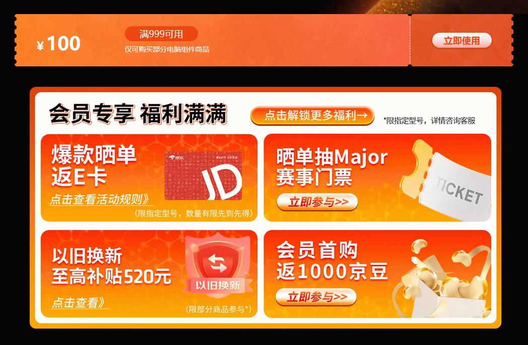 首先建议朋友们成为AMD京东自营旗舰店的会员,加入会员之后就可以解锁一系列的福利了,新会员首购返1000京豆,购买指定AMD爆款处理器可参与晒单返E卡的活动,晒单还可以抽Major赛事门票,以旧换新至高补贴520元。还有组装机品类领券满999减100元,板U套装,卡U套装更优惠。
