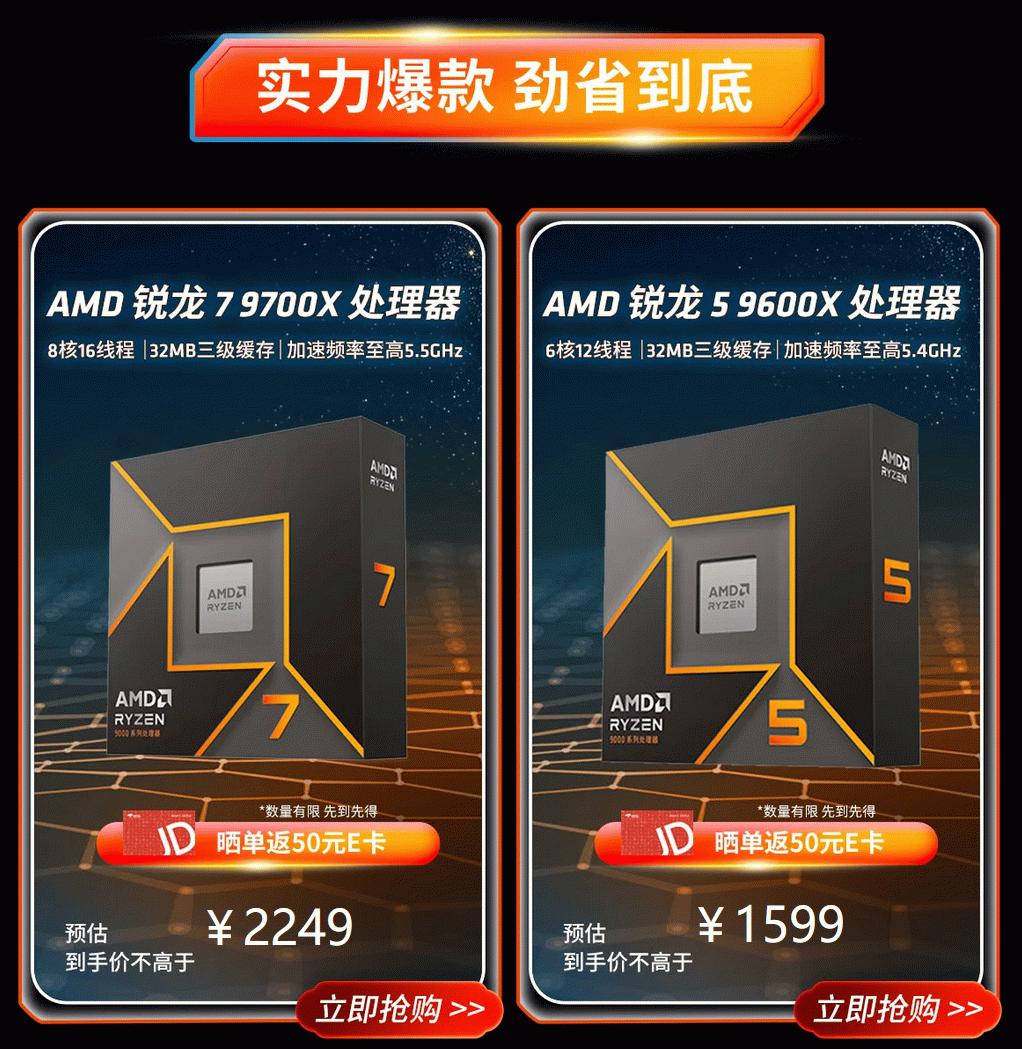 最优先为大家推荐的就是参与爆款晒单的两款产品,AMD 锐龙5 9600X处理器和AMD锐龙7 9700X处理器。这两款产品大家在领取了京东PLUS会员限时补贴后都来到了史低售价。作为全新AMD锐龙9000系列处理器中专为游戏玩家打造的产品,这两款处理器可以完美驾驭3A大作和主流网游,成为了很多DIY玩家的首选。