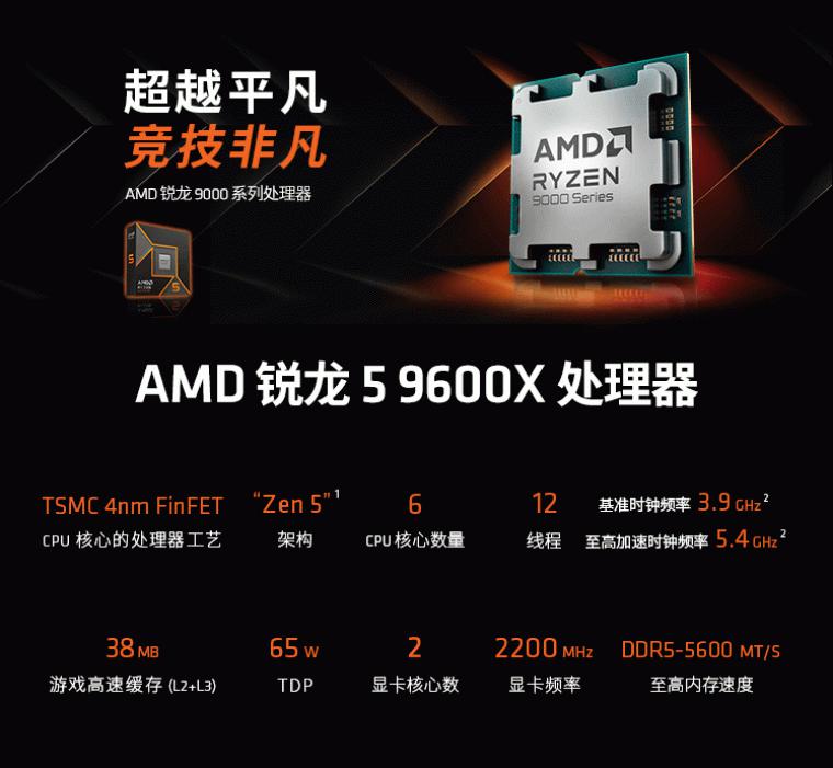 AMD 锐龙5 9600X处理器是锐龙9000系列处理器中价格最低的一款,但这款爆品在性能上却是不容小觑。它不仅可以畅玩《黑神话:悟空》这样现象级的3A大作,更是通杀目前主流竞技网游。AMD 锐龙5 9600X处理器采用了TSMC 4nm FinFET工艺制程的ZEN5架构,搭配6核心12线程的配置和高达5.4GHz的最高频率,总计38MB的游戏缓存和65W的功耗设计非常适合各类玩家使用。AMD 锐龙9000处理器适用于AM5插槽,支持PCIe 5.0和DDR5内存,AMD承诺这一代至少可以用到2027年+,大家可以放心战未来。