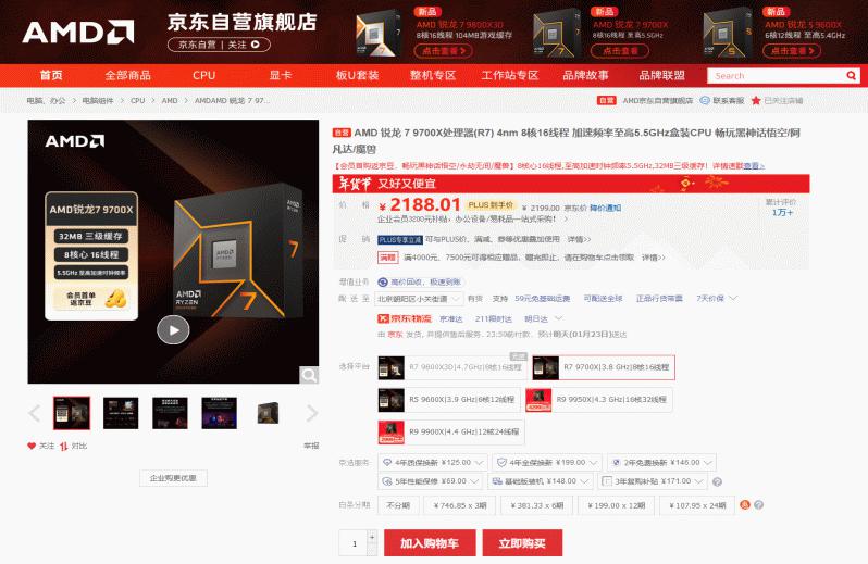 目前AMD 锐龙7 9700X处理器在京东自营旗舰店的报价是2199元,京东PLUS会员领取年货节补贴后还能再优惠。同时大家购买之后可参与晒单抽周边壕礼的活动(指定型号前往页面查看),成为京东旗舰店会员还有首购返666京豆和积分抽大奖活动。目前AMD 锐龙7 9700X处理器处于年货节低价,而且离春节假期真的没几天了,有攒机想法的朋友趁着有现货抓紧下单吧。