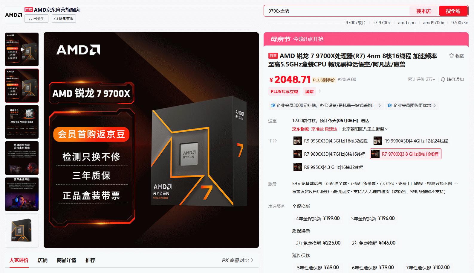 目前AMD 锐龙7 9700X处理器在京东自营旗舰店的报价是2059元,京东PLUS会员到手还能再优惠。同时大家购买之后可参与晒单抽周边壕礼的活动(指定型号前往页面查看),成为京东旗舰店会员还有首购返666京豆和积分抽大奖活动。近期AMD 锐龙7 9700X处理器的价格比较稳定,而且京东商城的母亲节大促即将开始,想要入手的朋友们可以稍微观望下今晚的活动再下单。