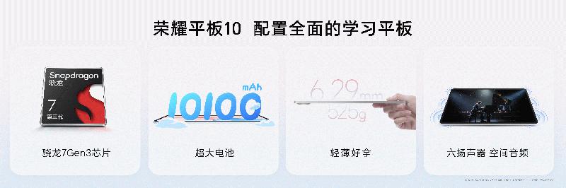 荣耀平板10全系搭载第三代骁龙7 Gen3移动处理器,内置10100mAh超大电池,